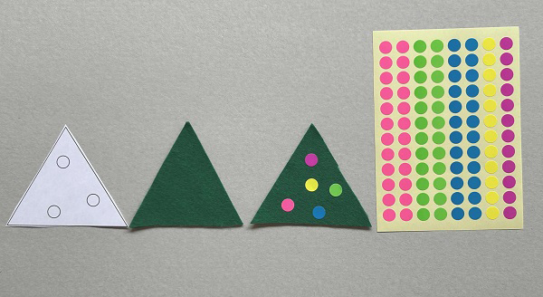 ④3枚の花びらを重ね、中心に黄色の丸形シールを3個貼ります。