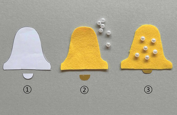 ③黄色のフェルトに鈴の部分とパールビーズを貼ります。