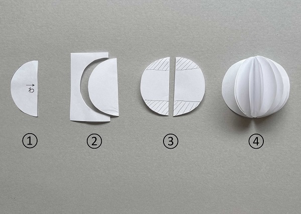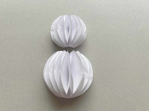 大きさの違う2つの半円状の胴体部分と顔部分を上下に重ね貼りあわせます。