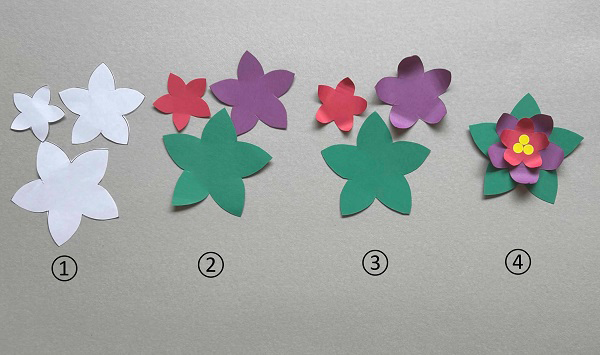 ②型紙を用いて、大の花びら(緑色の色画用紙)、中の花びら(紫色の色画用紙)、小の花びら(赤色の色画用紙)を切り抜きます。